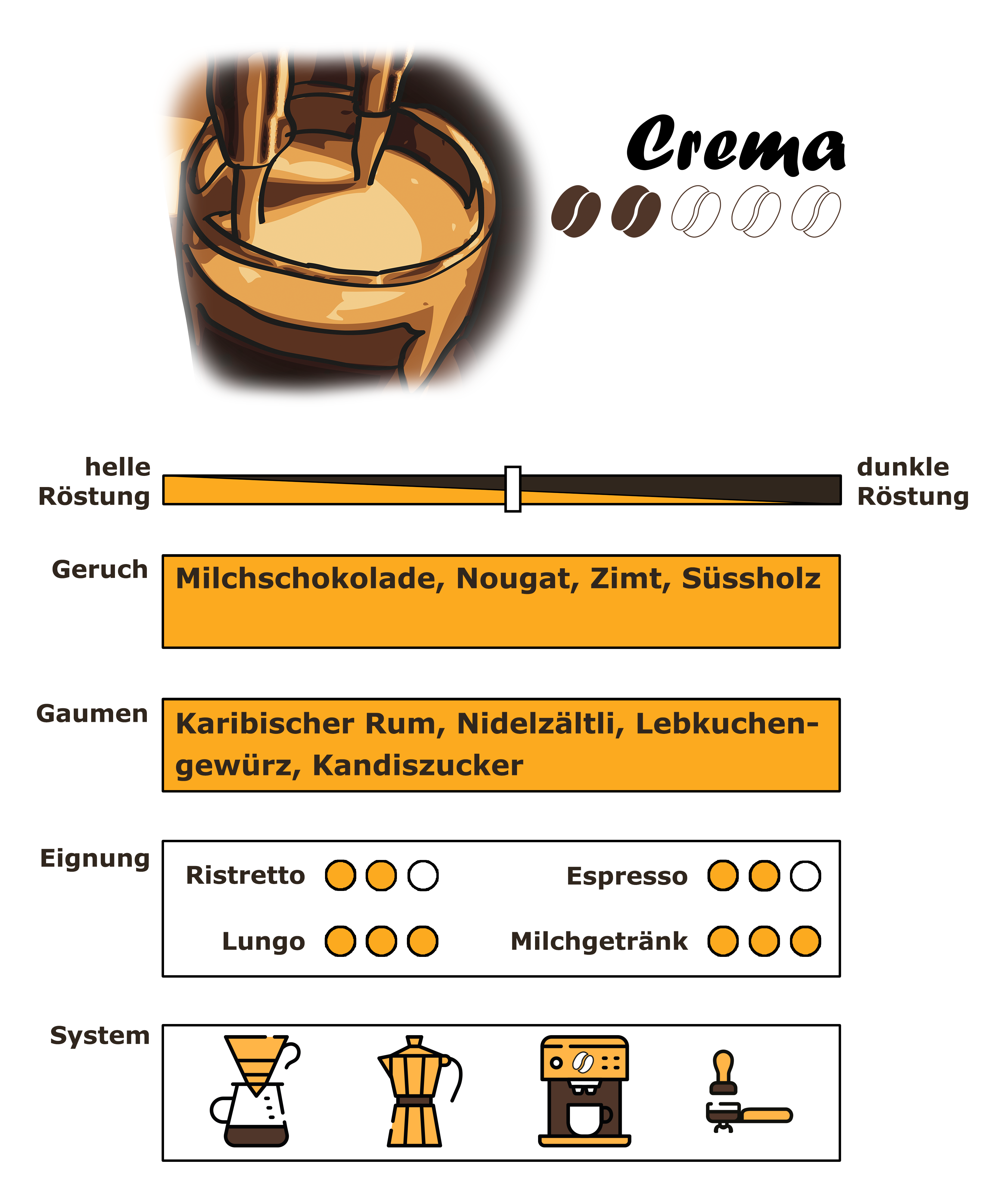 - Crema: sehr dicht, satt, cremig