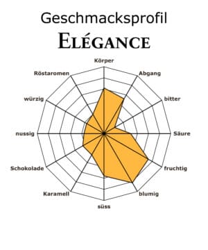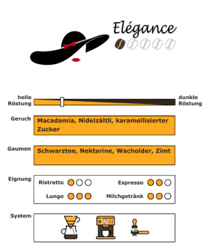 Rickli’s Elégance steht für feinen, harmonischen Kaffeegenuss mit ruhiger Eleganz. Die helle Röstung und die ausgewogene Mischung aus Arabica- und Robusta-Bohnen verleihen diesem Kaffee eine milde, magenmilde Struktur mit rundem Körper. Aromatisch zeigt sich Elégance zurückhaltend und differenziert: In der Nase prägen karamellisierter Zucker, Macadamia und Nidelzältli das Profil, am Gaumen entfalten sich feine Noten von Schwarztee, Nektarine, Wacholder und Zimt. Der Abgang ist weich, schokoladig und klar. Elégance eignet sich besonders als leichter Café Crème oder milder, aromatischer Filterkaffee für den täglichen Genuss.
