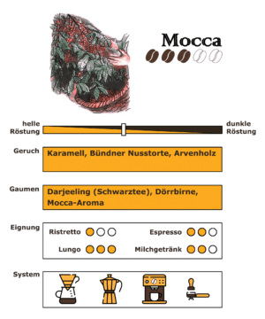 Die mittlere Röstung und die Mischung aus Arabica- und Robusta-Bohnen verleihen Rickli’s Mocca ein cremiges Schäumchen und eine ausgewogene Intensität. In der Nase zeigen sich Karamell, Bündner Nusstorte und Arvenholz. Am Gaumen entfalten sich feine Noten von Darjeeling-Schwarztee, klassischem Mocca-Aroma und Dörrbirne. Der Kaffee ist leicht kräftig und bietet Struktur und Fülle ohne Schwere.