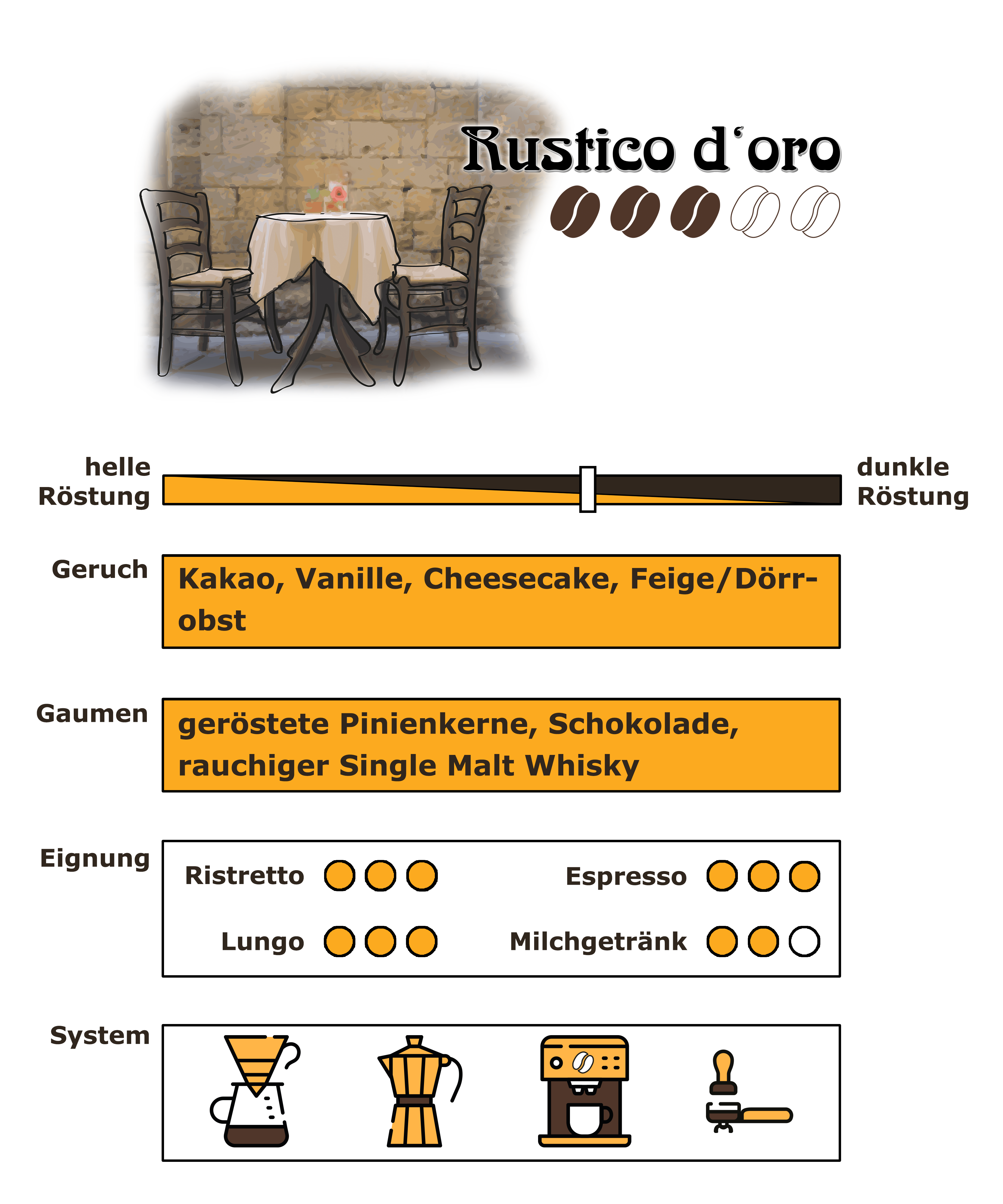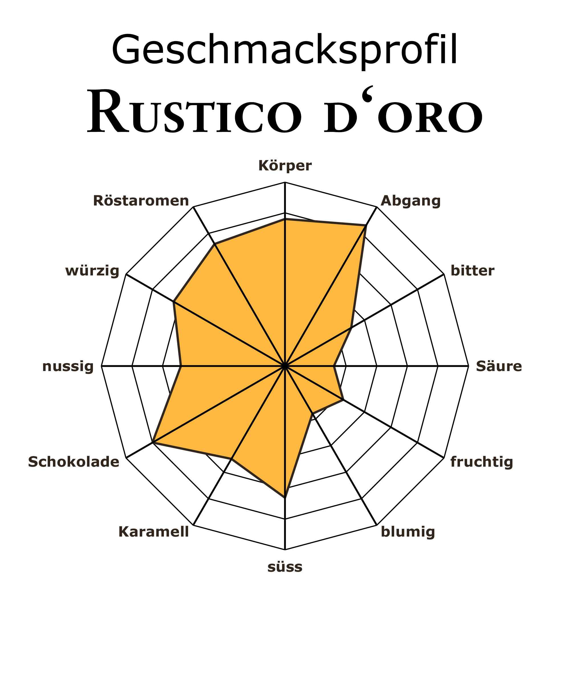 Rickli’s Rustico von Rickli’s Kaffeerösterei ist ein kräftiger, rustikal geprägter Kaffee mit Tiefe und Charakter. Die ausgewogene Mischung aus Arabica- und Robusta-Bohnen wird mittel geröstet und überzeugt mit vollem Kaffeearoma bei niedrigem Säuregehalt. In der Tasse zeigt sich ein tief erdiger, leicht herber Stil. Der Duft erinnert an Kakao, Dörrobst und Lakritze, am Gaumen entfalten sich Noten von Single Malt Whisky, Milchschokolade und feiner Vanille. Eine dunkelgoldige, dichte Crema rundet den kraftvollen Gesamteindruck ab.